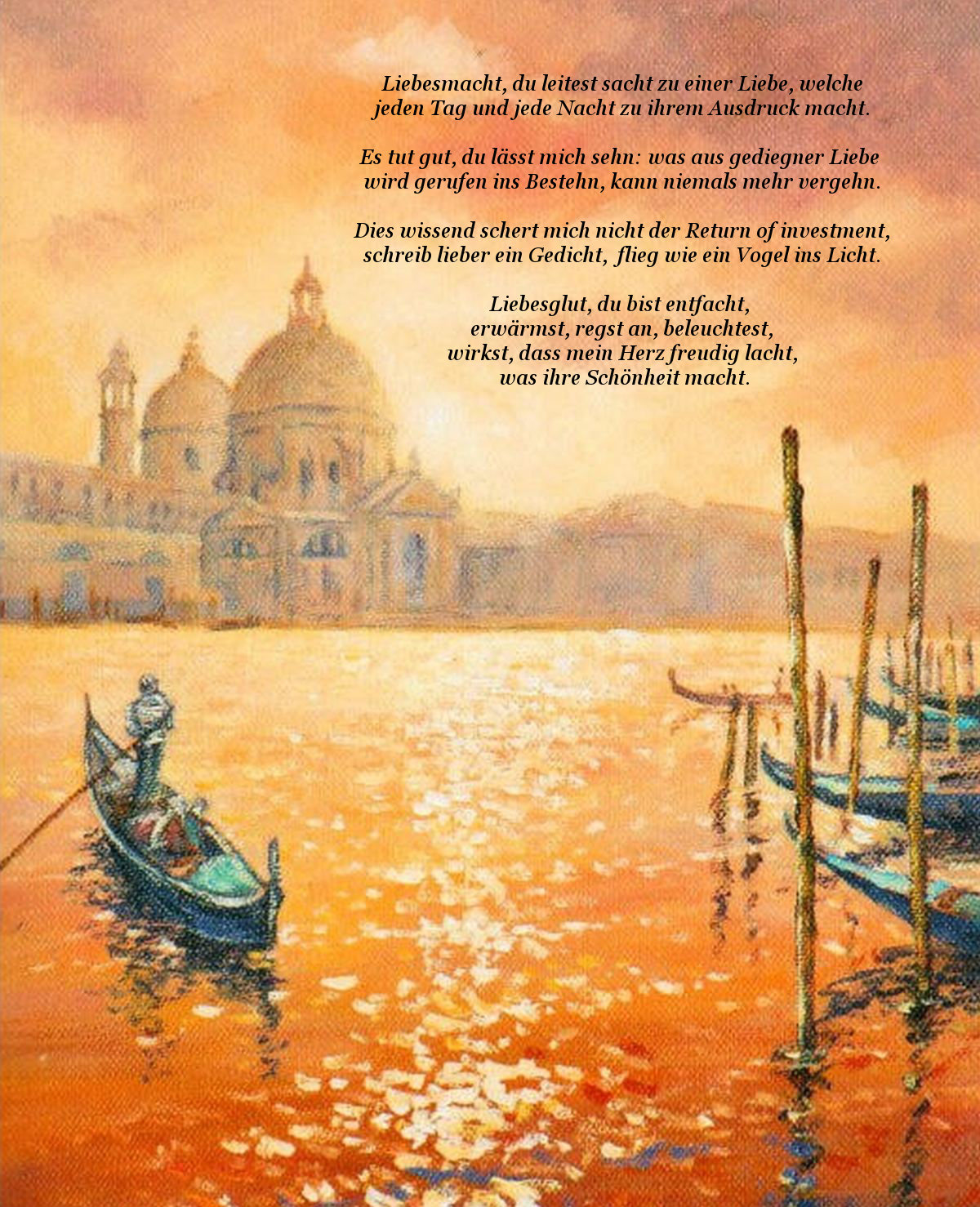 wenn ich einen Liedtext modifiziere, bedeutet das nicht, dass ich meinen Text für besser als das Original halte – es ist dann nur mehr von meinem Fühlen, Denken und Weltbild darin eingewebt. Angesichts von so schwerem im Raum Stehenden wie Martern aller Arten durfte es diesmal etwas beruhigend Schaukelndes sein. Was bot sich da mehr an, als die Barcarole von Jacques Offenbach?! Auch das Original ist schön, aber etwas, das man auch anders sehen kann, ist das darin zum Ausdruck kommende körperorientierte Mainstream-Verständnis von Zeit als etwas Entweichendem. Ja, auch ich bin ein Genießer und kenne Sehnsucht und bin auch kein Freund davon, den Himmel nur in ferner Zukunft zu erhoffen, statt ihn ins Hier und Jetzt zu holen, und habe auch nichts dagegen, wenn andere für ein paar Jahrzehnte völlig in die Illusion der Vergänglichkeit eintauchen, aber zu entdecken, dass ein wesentlicher Teil von uns nichts Endliches ist, und es sich beim Zerrinnen der Zeit folglich um eine Illusion handelt, und vor allem die äußerst weitreichenden Implikationen dieser Perspektivenänderung – auch schon für dieses Leben – zu entdecken, finde ich noch deutlich vergnüglicher, als sich der Illusion hinzugeben. Jedenfalls wäre mir für das Motiv, aus welchem heraus meine Gedichte entstehen, ein Erdenleben ähnlich zu kurz, wie eine Nacht. Hier also ist die neue Version der Barcarole: